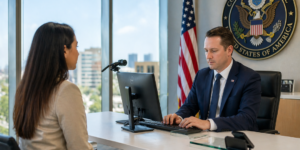 Durante a entrevista, a atenção do agente está dividida entre o solicitante e a interface do sistema consular (como o Consular Consolidated Database – CCD). Aqui está o que eles costumam registrar: